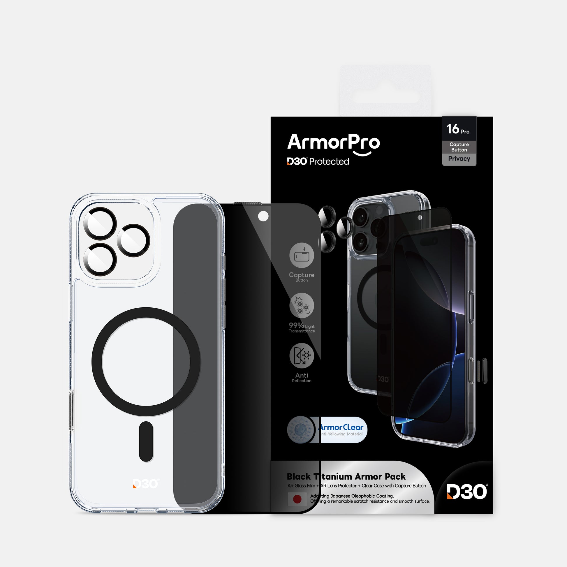 ArmorPro D3O 3-in-1 Combo (Privacy Anti-Reflective Screen Protector & DoubleAR Camera Lens & D3O Clear Case with Black MagSafe) for iPhone 16 Pro & iPhone 16 Pro Max