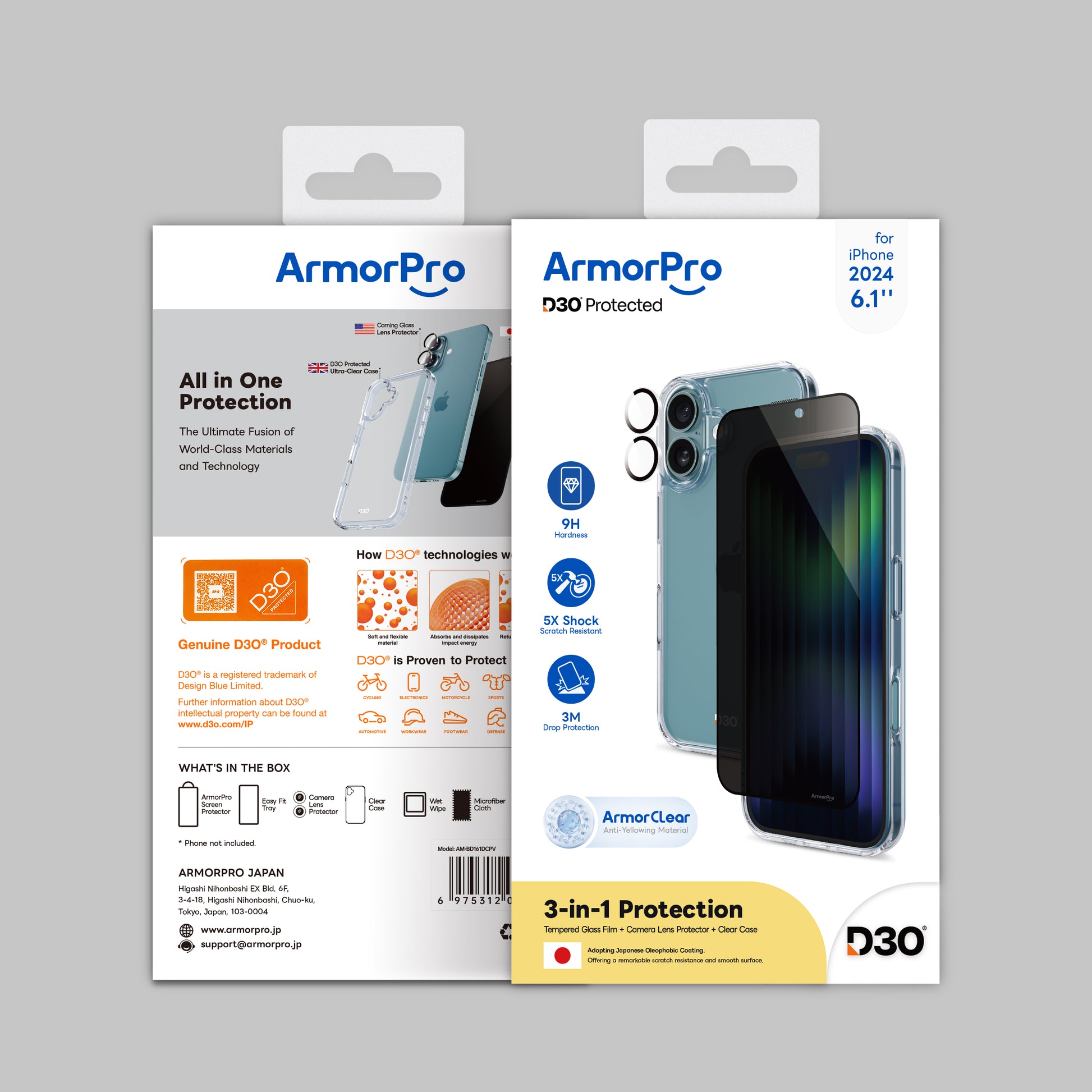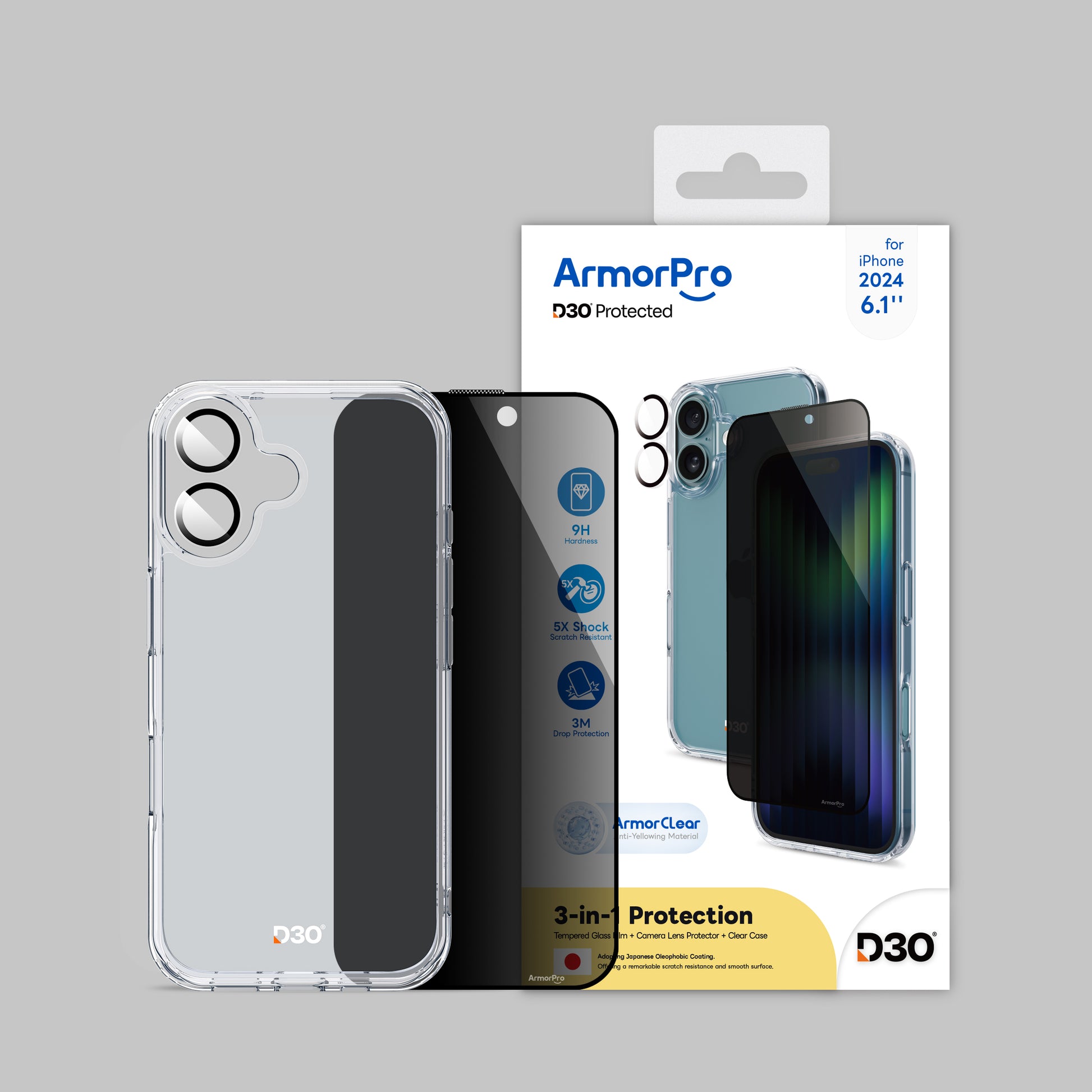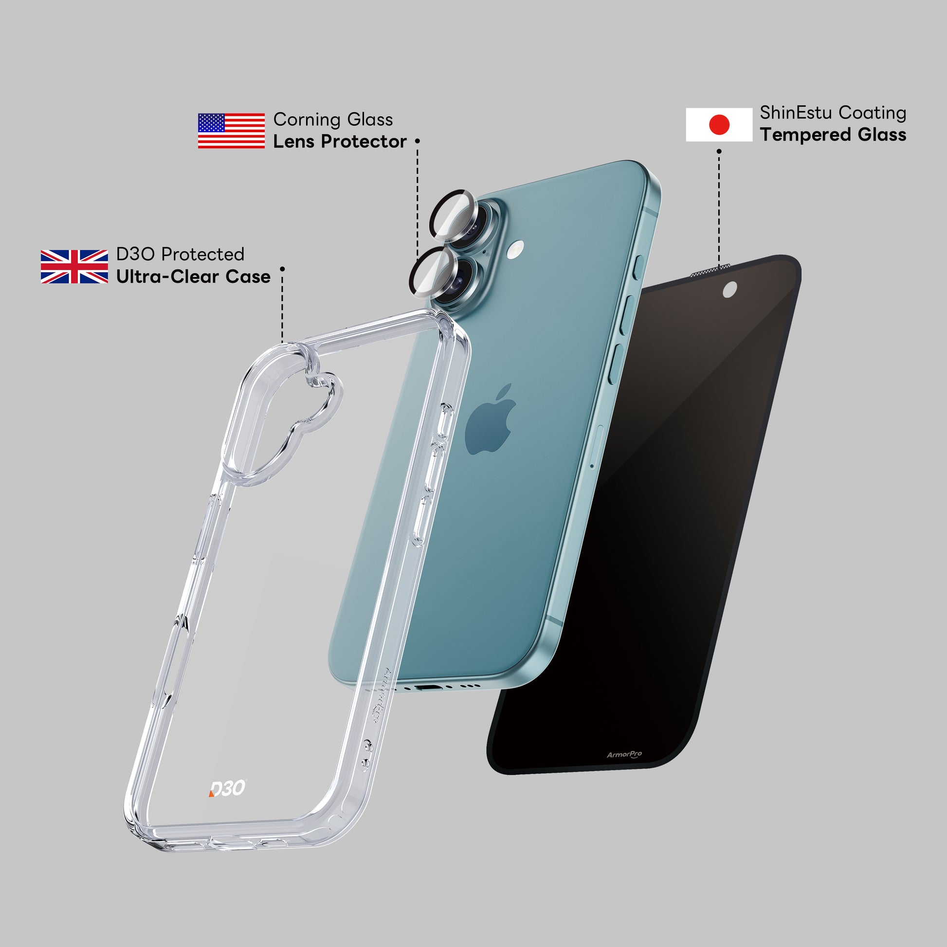 ArmorPro D3O 3-in-1 Combo (Privacy Screen Protector & Camera Lens & Clear Case) for iPhone 16 Series