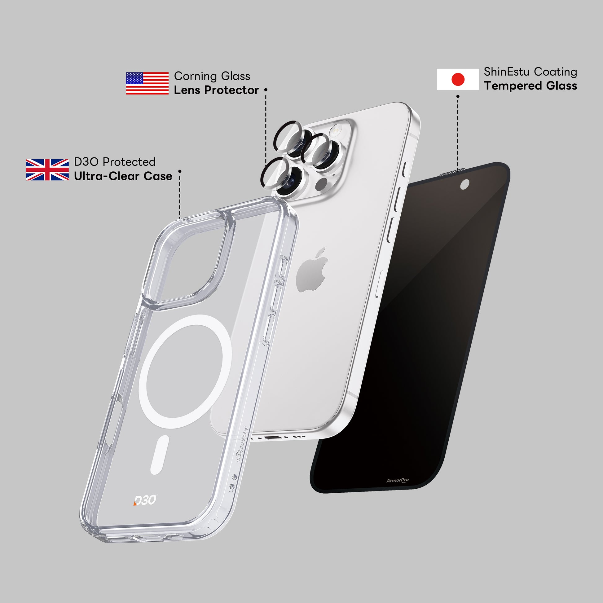 ArmorPro D3O 3-in-1 Combo (Privacy Screen Protector & Camera Lens & Clear Case with MagSafe) for iPhone 16 Series